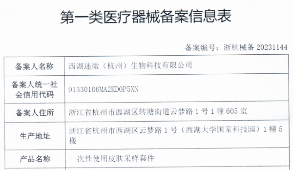 在2023年度即將完美收官之際,我公司自行研制的一次性使用皮膚采樣套件獲得杭州市市場監(jiān)督管理局的第一類醫(yī)療器械備案許可,西湖迷微首個(gè)醫(yī)療器械產(chǎn)品正式獲批上市!