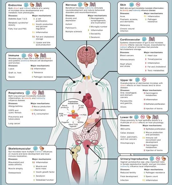 微生物區(qū)系通過(guò)產(chǎn)生毒素或有害代謝物或使用營(yíng)養(yǎng)物質(zhì)來(lái)防止有害生物的定居,這些有害生物可能會(huì)導(dǎo)致或加劇疾病發(fā)展。寄生微生物可以產(chǎn)生直接影響各種組織內(nèi)細(xì)胞發(fā)育和功能的分子。骨髓和胸腺中的免疫細(xì)胞以及胰腺、腸、腦等的非免疫細(xì)胞都是如此。
