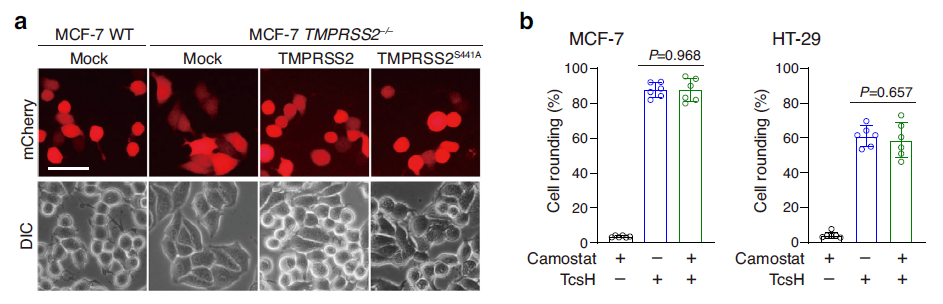 TMPRSS2 由于廣泛參與了包括流感、SARS、MERS 等在內的多種病毒的細胞入侵而“臭名昭著”。TMPRSS2 參與病毒入侵的方式是通過其絲氨酸蛋白酶活性激活病毒的刺突蛋白,從而促進膜融合。有意思的是,TMPRSS2 的絲氨酸蛋白酶活性與其介導 TcsH 入侵完全無關(圖2)。另一方面,TMPRSS2 可以特異性地與 TcsH 進行結合,親和力高達0.13 nM。說明與“助攻”病毒感染的模式不同,TMPRSS2 是作為直接的蛋白受體協(xié)助毒素 TcsH 入侵靶向細胞的。
