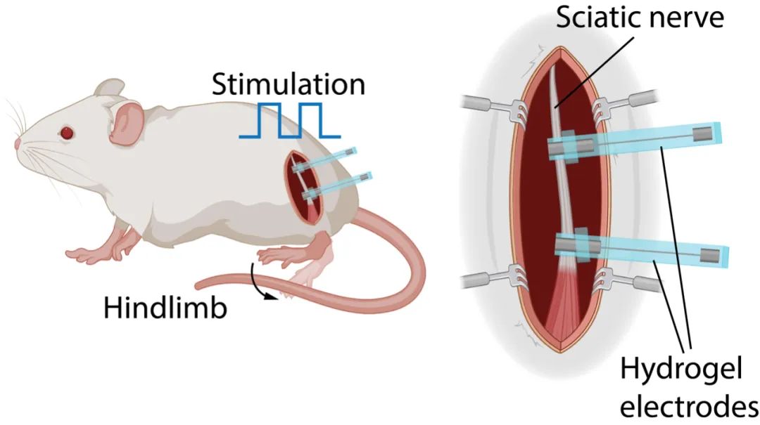 而這套方法的“終極目標”,就是和生命體進行直接的“連接”,而這一點也在小鼠實驗上得到了非常成功的效果。實驗團隊制備了可用于提供電刺激的全水凝膠電極,可以通過簡單的手術(shù)纏繞在小鼠的坐骨神經(jīng)上。在1Hz頻率的脈沖式電壓刺激下,3D打印電極可在低達100mV的電壓下引起小鼠腿部的規(guī)律大角度運動。而作為對照的離子導電水凝膠的電極則在250mV的的驅(qū)動電壓作用下也只可勉強引發(fā)小鼠腿部微小的運動。