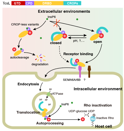 基于上述發(fā)現(xiàn),研究者們提出了一種組合重復(fù)寡肽區(qū)域調(diào)控TcsL及其它大梭菌毒素穩(wěn)定性和毒性的模型(圖6)。作為一類外毒素,TcsL在被細(xì)菌釋放到胞外后將面臨各種復(fù)雜的環(huán)境條件。毒素可能以開放和關(guān)閉兩種構(gòu)象存在,其中開放式構(gòu)象的組合重復(fù)寡肽區(qū)域舒展,暴露出毒素的核心區(qū),這種構(gòu)象對于攻擊宿主細(xì)胞更為有利。而在一些相對嚴(yán)厲的條件下(如低pH值等),毒素傾向于轉(zhuǎn)變?yōu)殛P(guān)閉式的構(gòu)象,這種構(gòu)象分子結(jié)構(gòu)更為緊密和牢固,不易發(fā)生自剪切和降解。這種構(gòu)象更利于維持毒素的穩(wěn)定性和活性,直至毒素分子接觸到其目標(biāo)宿主細(xì)胞。