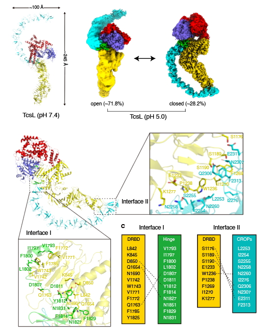 圖4. TcsL存在開放和關(guān)閉這兩種不同的構(gòu)象,其中關(guān)閉式構(gòu)象會形成兩個分子內(nèi)作用界面