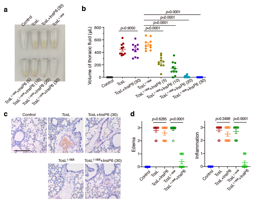 接下來,研究者們模擬了TcsL釋放到環(huán)境中,之后再接觸宿主的情形。利用小鼠攻毒模型結(jié)合病理分析,研究者發(fā)現(xiàn)缺少組合重復(fù)寡肽區(qū)域的TcsL在存在InsP6的環(huán)境中暴露僅僅20分鐘即會完全失活,這對于一種外毒素來說是不可接受的缺點。而全長的TcsL在類似環(huán)境下30分鐘也不會有任何活性損失(圖5)。最后,研究者們還將這一規(guī)律在大梭菌毒素家族的其他成員,包括TcdA,TcdB,TcsH和Tcnα中進(jìn)行了驗證,發(fā)現(xiàn)它們的組合重復(fù)寡肽區(qū)域也有著類似的作用。
