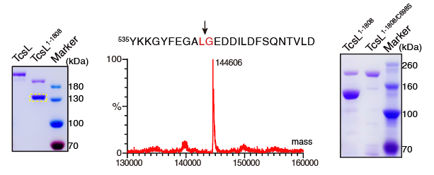 圖2. 缺失組合重復(fù)寡肽區(qū)域會造成TcsL中半胱氨酸蛋白酶活性失控